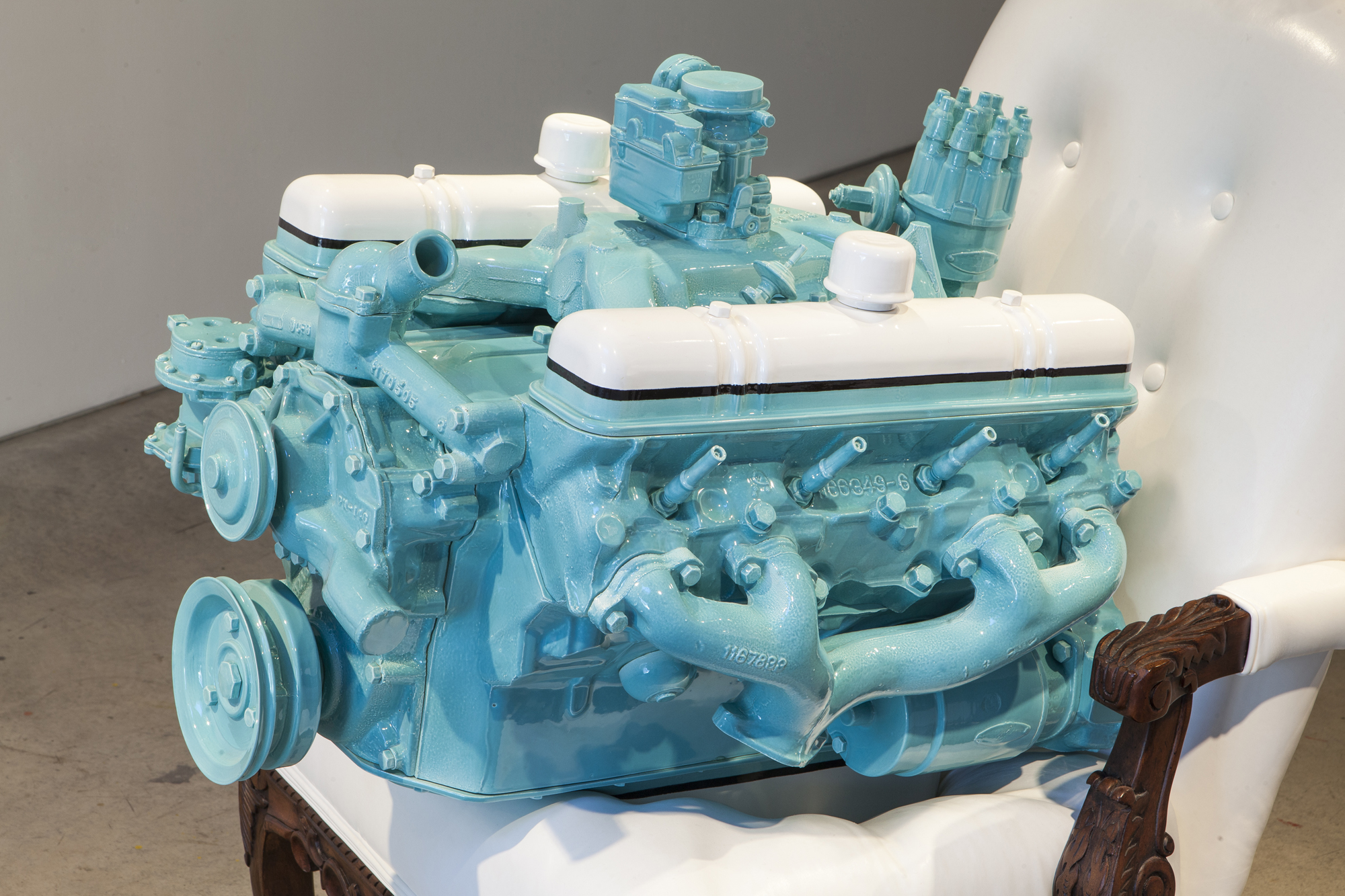 Engines hold a significant place in the collective memory of our car-centric society, evoking inherited perceptions of masculinity. By altering their materiality, Neufeld subverts their masculine character and the inherent connotations they hold as meaningful cultural objects. Furthermore, the mechanical parts the artist selects predominantly date from the 1950s and 60s, a time when nothing was yet digitally controlled and everything could be fixed with the right knowledge and a few tools. Triggering private associations, the sculptures allow for a moment of unlikely intimacy and become vessels of memory, connecting personal and collective histories.