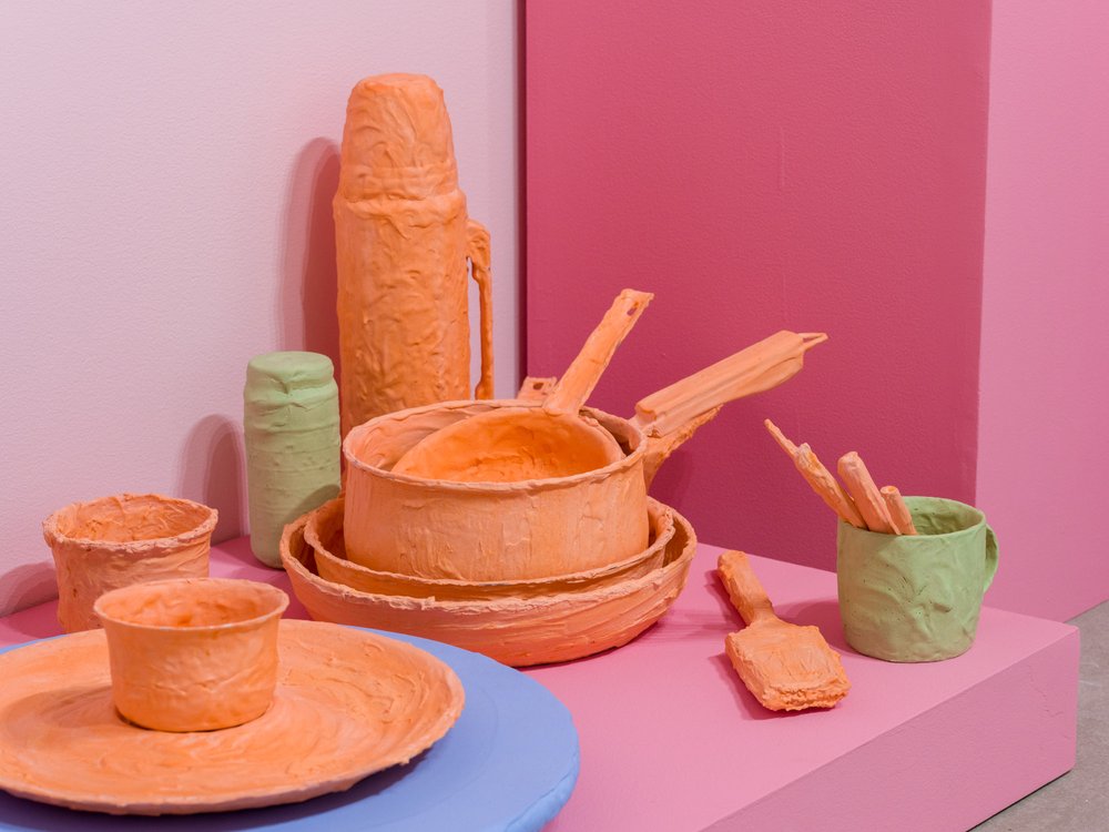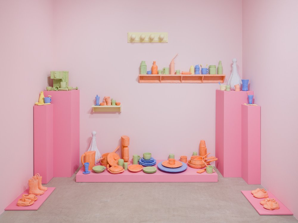 Made from ground gypsum, drywall mud serves both a structural and an aesthetic purpose, providing physical support and smoothing walls for a clean, continuous appearance. When pigmented with colourful chalk powder, it marks areas for repair. A similar form of gypsum can be used in plaster casting to produce moulds for artistic purposes. Fleming extends the use of these contractor-grade materials, just as he extends the life of household objects otherwise headed for recycling or landfill. Going against their traditional functionality, he pushes their inherent formal capabilities to new creative ends. In this process, he captures daily life – its intimate accumulations of things and gestures – in an arrested instant, perpetually fixed. Caught in cheerfully tinted mud, the objects that make up the living space are all still there – perhaps even more so as they have been entombed in place – yet at the same time they are not. They have become their own embodied, poignant absences.Swathed in mud, things shed their distinctiveness, making evident their connectedness – an invisible skin enveloping the living space where life unfolds. In this suspension of reality, Fleming opens up an array of opportunities – for reflection, emotion, action, play. He creates a generous playground where guests are invited to experiment. The setting of domestic relationality becomes the stage of artistic interventions that build on and expand Fleming’s initial intentions, mediating further relations with reality. Successively invited to contribute individual responses in A Mudroom, artists Patrick Cruz, Shellie Zhang, Élise Provencher, Ingrid Syage Tremblay, Celia Perrin Sidarous, GHY Cheung, Nicolas Grenier and The Mud Painters youth workshop take up the challenge with the same liberating spirit in which it is offered. They incorporate new objects that contrast the ghostly presence of their mudded counterparts, present inspired narrative threads, and evoke art historical counterpoints to the given aesthetic premise.