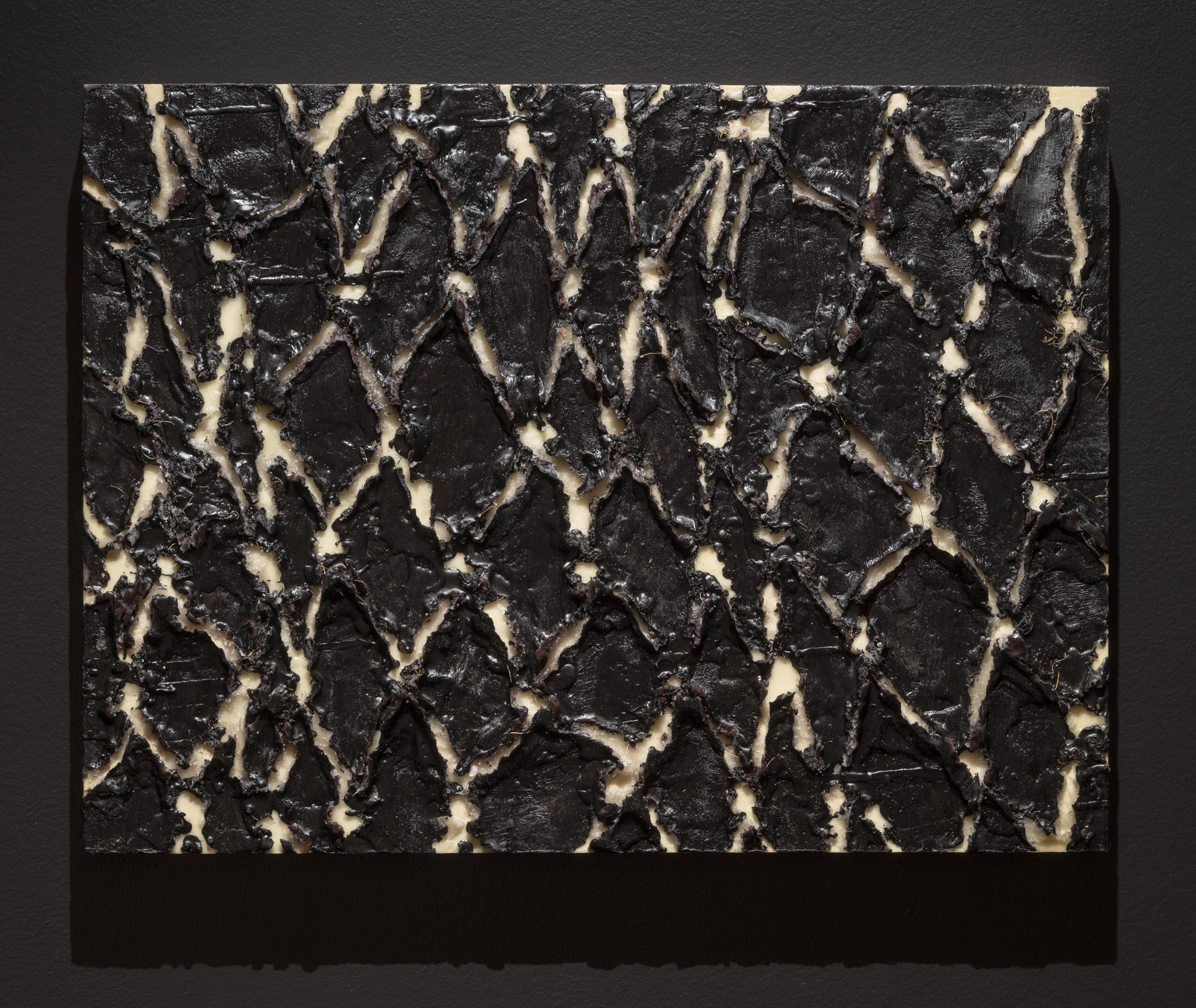 Driven by an impulse to repair, Collins’ visceral paintings attempt to suture, layer and preserve the damaged. This new work further strives to dismantle and reconfigure the painted surface, pushing against the physical limits of materials lifted from stretchers and sculpturally re-envisioned. Engaging the potent vocabulary of the colour black, Collins evokes the accumulation of all colours, the darkest shadows, the burnt remains, the fertile soil, creating poignant works that consider both frailty and resilience. Holes, rips and indentations in the fabrics create permeable layers that disperse yet hold together the whole, materializing absences.